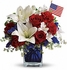 Red roses, white asiatic lilies, white alstroemeria, blue statice and red carnations are gathered with green pitta negra, seeded eucalyptus and a small American flag in a cobalt blue glass cube