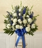 Convey your deepest condolences at this sorrowful time with this touching tribute. Our florists arrange beautiful flowers such as white football mums, blue delphiniums, white gladiolus, white roses, and more