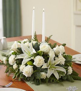 Glorious roses lead the way as these winter whites come to tabletop or den, along with fresh carnations, lilies and mini carnations
