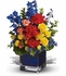 An artist's palette of color spontaneously bursts forth in this array of favorite flowers in a blue contemporary glass cube vase