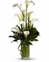 •Eleven large white calla lilies are mixed with small aralia leaves, variegated aspidistra leaves and delicate lily grass in a clear glass vase.