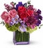 This exquisite mix of feminine blooms is like a breath of fresh air! Sweet pinks and purples are contrasted with a modern burst of fresh green hydrangea, and finished off with a pretty lavender cube vase lined with a tropical aspidistra leaf. It's a fun pick-me-up to send anytime, anywhere