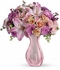 The elegant bouquet includes light pink spray roses, pink Asiatic lilies, light pink miniature carnations, lavender cushion spray chrysanthemums, pink waxflower, seeded eucalyptus and variegated pittosporum.