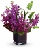 Send someone on a tropical honeymoon – if only in their mind – with this exotic, romantic gift. Delicate purple orchids are presented with tropical leaves and ferns in a chic -colored glass cube.