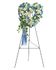 This heartfelt arrangement features blue hydrangea, white spray roses, and variegate- We delivery funeral home Irving, TX 75061-75060