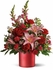 A mix of fresh flowers such as snapdragons, carnations, Asiatic lilies and a rose – with accent flowers and greenery – is delivered in a red Teleflora Satin Collection cylinder