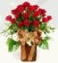 24 stalks red roses arranged with white fillers and green leaves in a basket
