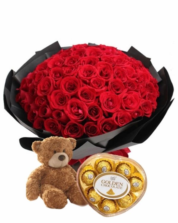 Rose bouquet w bear and choocolate