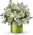 The classic arrangement includes white alstroemeria, green carnations, green roses, a white lily and white stock accented with seeded eucalyptus, variegated pittosporum and rhombus.