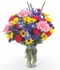 This brilliant bouquet of irises, carnations, viking poms and mini carnations arranged in a classic fluted glass vase l